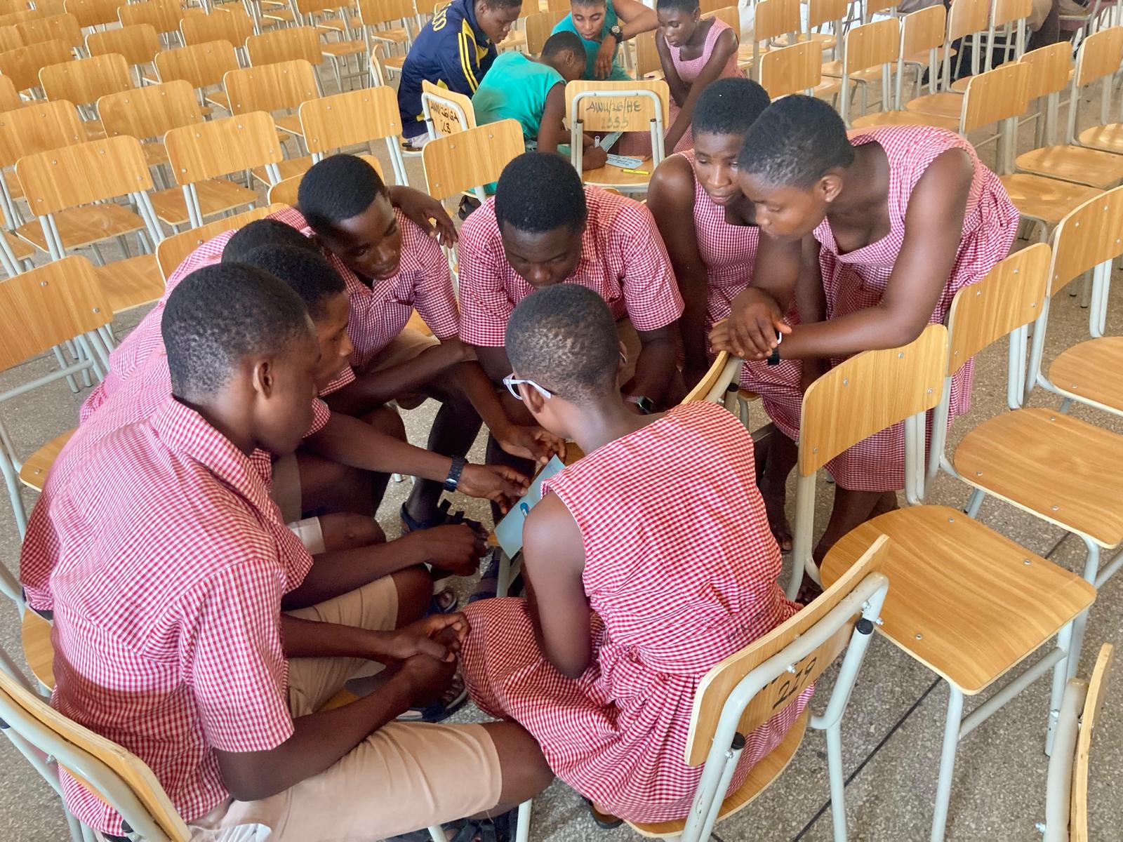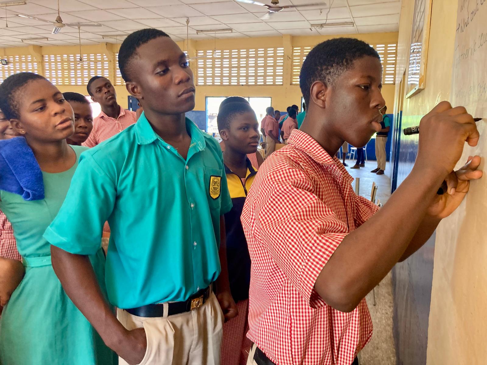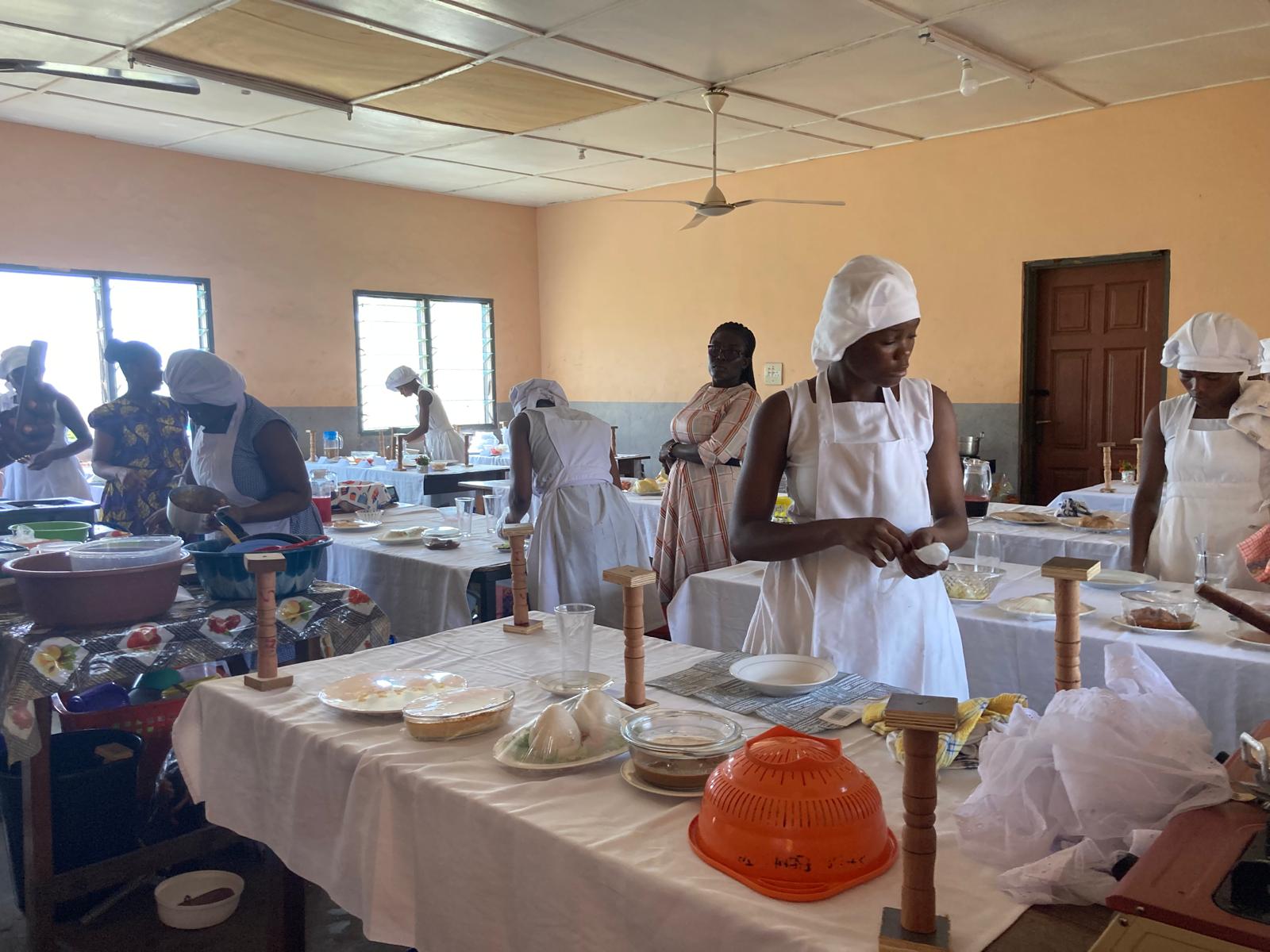 Im Eingang zur Küche stand ein Tisch voller Lebensmittel, aus dem sich jede Schülerin die Lebensmittel für ihr selbst kreiertes Menü – natürlich wunderschön dekoriert – nehmen konnte. Gerne hätten wir probiert. Der einzige Junge in dieser Lerngruppe stampfte rhythmisch und engagiert Yamswurzel mit einem Holzpfahl für das Nationalgericht Fufu. Eigentlich eine Aufgabe, die traditionell von Frauen ausgeführt wird. Man muss sicher nicht erwähnen, dass es draußen schon bereits sehr heiß war, in der Küche aber herrschte eine für uns kaum zu ertragende Hitze. Wie die Jugendlichen, aber auch die Lehrerinnen, die von 6.30 Uhr bis 16.30 Uhr eine Gruppe nach der anderen in dieser Küche unterrichteten, das aushalten, ist schwer zu begreifen.