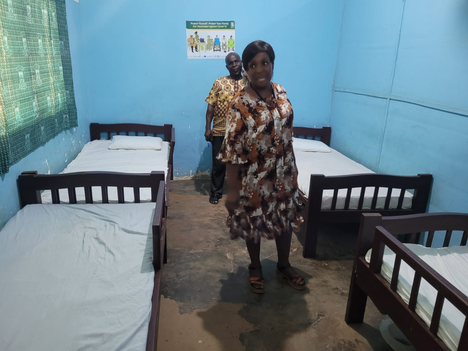 Schulleiterin Rita Azoro zeigt uns die „female ward“ („Station“ für Mädchen) mit vier richtigen Betten