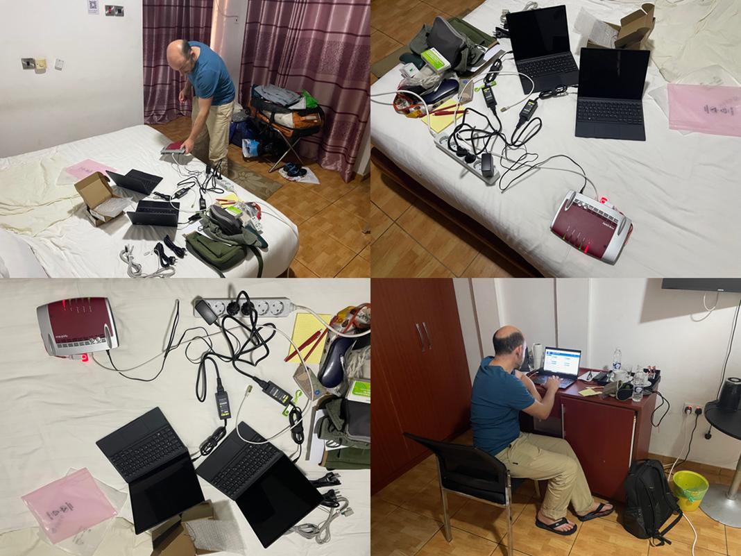 Deshalb nutzen wir die Zeit weiter, um unsere diversen schriftlichen Aufgaben zu erledigen, uns nach Wohnalternativen umzusehen und, um zumindest teilweise einen Computer-Schulungsraum aus den im Handgepäck mitgebrachten Rechnern technisch vorzubereiten. Natürlich müssen wir auch diverse Telefonate führen und unsere Partner über die weiteren Verzögerungen zu informieren.