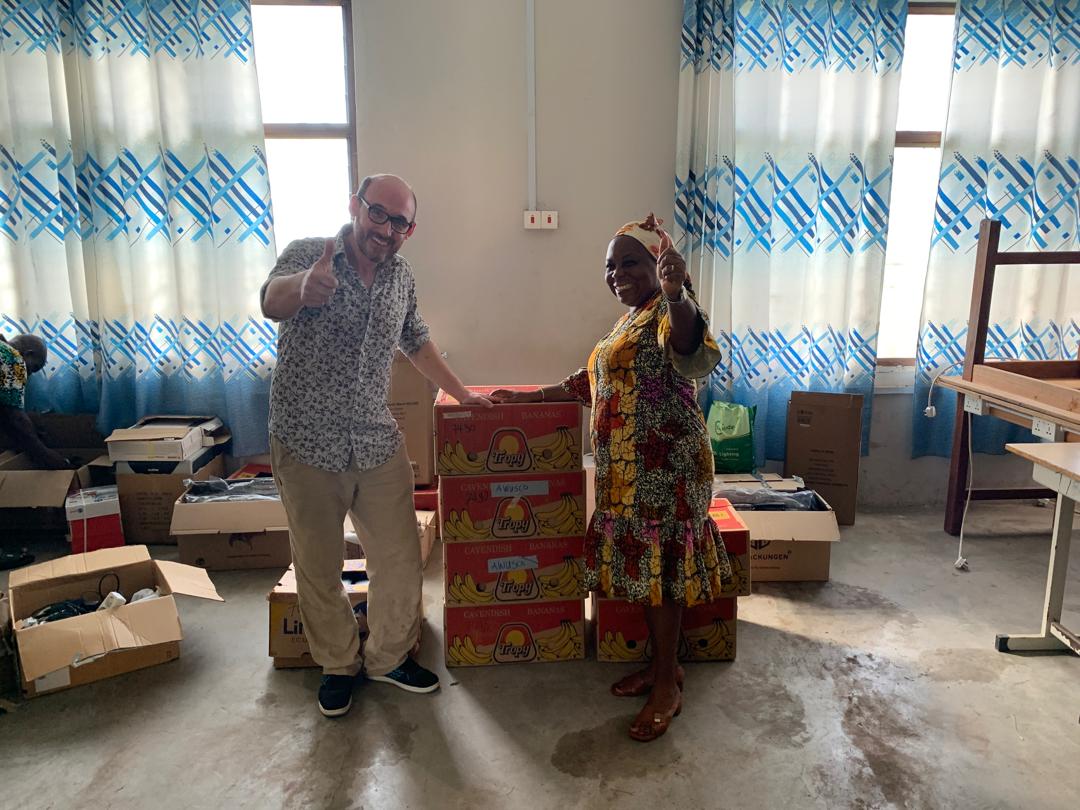 Nächster Stopp in Ho: Mawuko Girls‘ Senior High School. Auch hier unterstützte der Politiker die symbolische Übergabe der HITA PC-Labs symbolisch durch Übergabe eines Laptops durch Daniel an ihn als Vertreter der Region weiter an die Schule. Neben den 120 Laptops für 3 HITA PC-Labs und Lehrmaterialien konnten wir hier auch über 20 Nähmaschinen an die Initiative SIPRI überreichen, die nachhaltige und erschwingliche wiederverwendbare Damenbinden herstellen möchten. Auch hier wurde in den vergangenen Wochen viel vorangebracht. Ein Lager- und Werkstatraum für den IT-Bereich wurde bereitgestellt. Die bestehenden Räume wurden aufgeräumt und das Mobiliar wurde teilweise repariert.