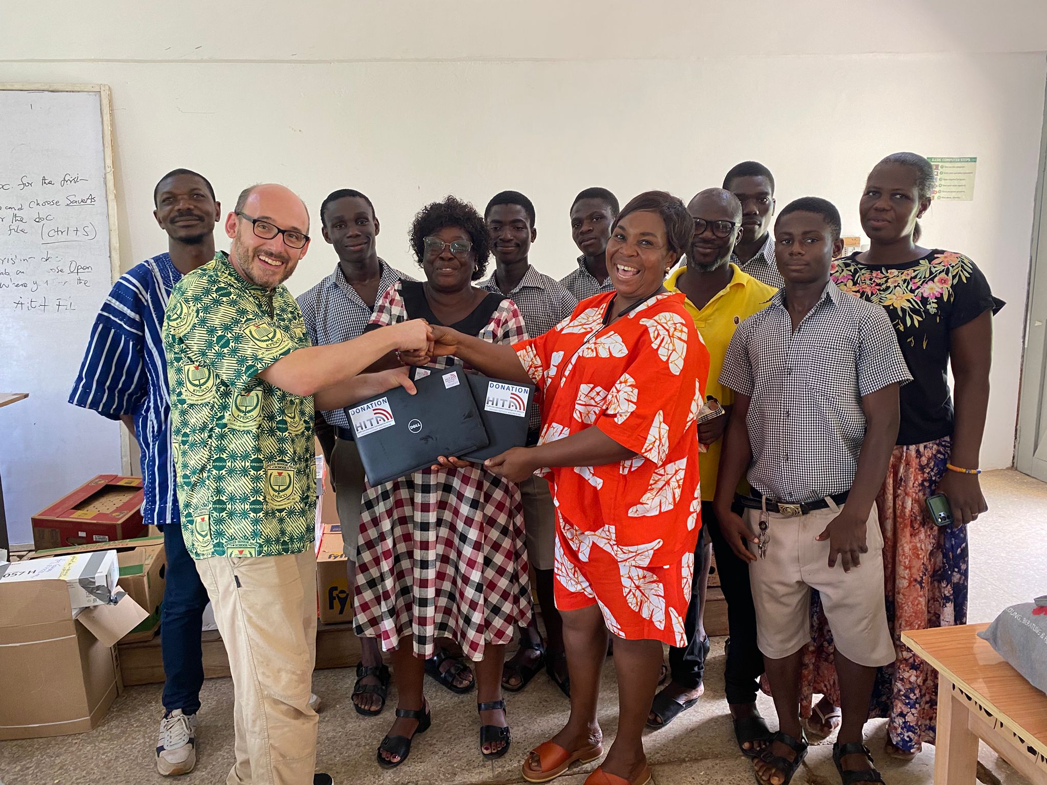 So ging es also am letzten Tag der Reise nochmal nach Tsito, Ho und Kpedze – mit einer harten Deadline, denn um kurz nach zehn am Abend hebt der Flieger in Richtung Deutschland ab. Zügig und ohne Stau erreichten die Awudome Senior High School in Ho. Hier hatten wir bereits die ersten rund 20 HITA-Computerarbeitsplätze im Rahmen der Unterzeichnung der Zusammenarbeitsvereinbarung aufgebaut. Als wir ankamen, waren wir beeindruckt. Der HITA PC-Lab-Raum wurde in den vergangenen Wochen weiter ausgestattet: Die Tischplatten waren erneuert worden, der Boden wurde modernisiert und alle Computer haben eine Schutzhülle gegen Staub erhalten. Die Freude war riesig, dass noch einmal rund 100 weitere Laptops hinzukommen. Damit kann die Schule drei HITA PC-Labs vollständig und modern ausstatten.