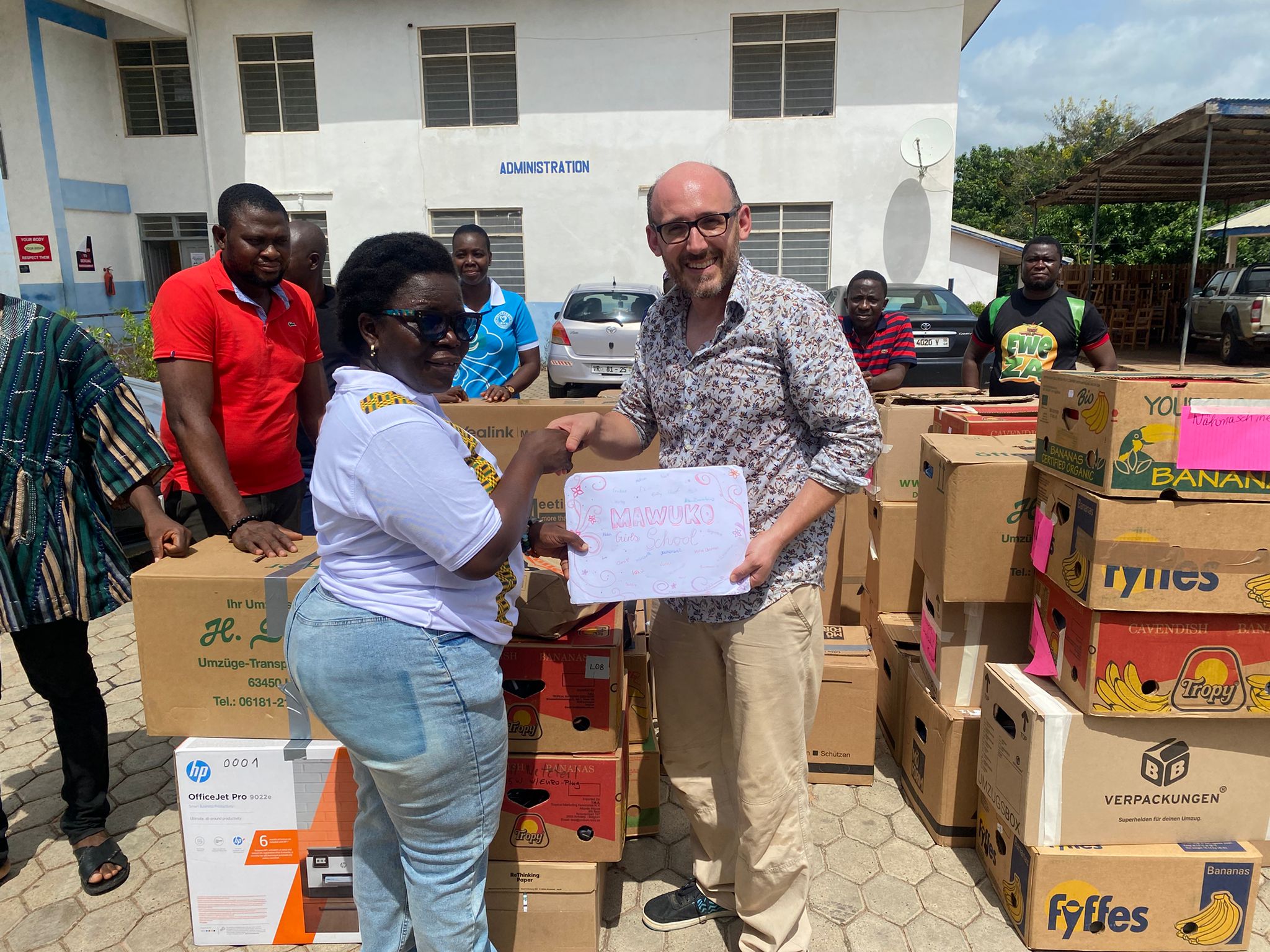 In Kpedze ist nicht nur die Wiedersehensfreude groß. Die Freude beim Schulmanagement, dem Förderverein, dem IT-Bereich und bei den Schülerinnen und Schülern wortwörtlich von den Gesichtern abzulesen. Damit hätte niemand gerechnet. 120 hochwertige Laptops sowie 4 Smartboards sorgen für Begeisterung. Smartboards, das sind große Bildschirme mit berührungsempfindlicher Oberfläche, die zur Präsentation von Lehrmaterialien, aber auch für interaktive Lern- und Kollaborationsprojekte eingesetzt werden können. Auch die Verabschiedung war gewohnt herzlich. Die Freude auf ein Wiedersehen und auf die weitere Zusammenarbeit ist groß.