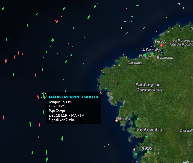 Unser Container ist mittlerweile wahrscheinlich schon an der Westküste des nördlichen Afrikas. Zum Zeitpunkt der Recherche befand sich die Maersk MCKinney Moller noch westlich von Santiago de Compostela und fuhr mit fast 30 km einen südlichen Kurs. Hoffentlich kommt der Container, wie geplant am Ostermontag in Ghana an.